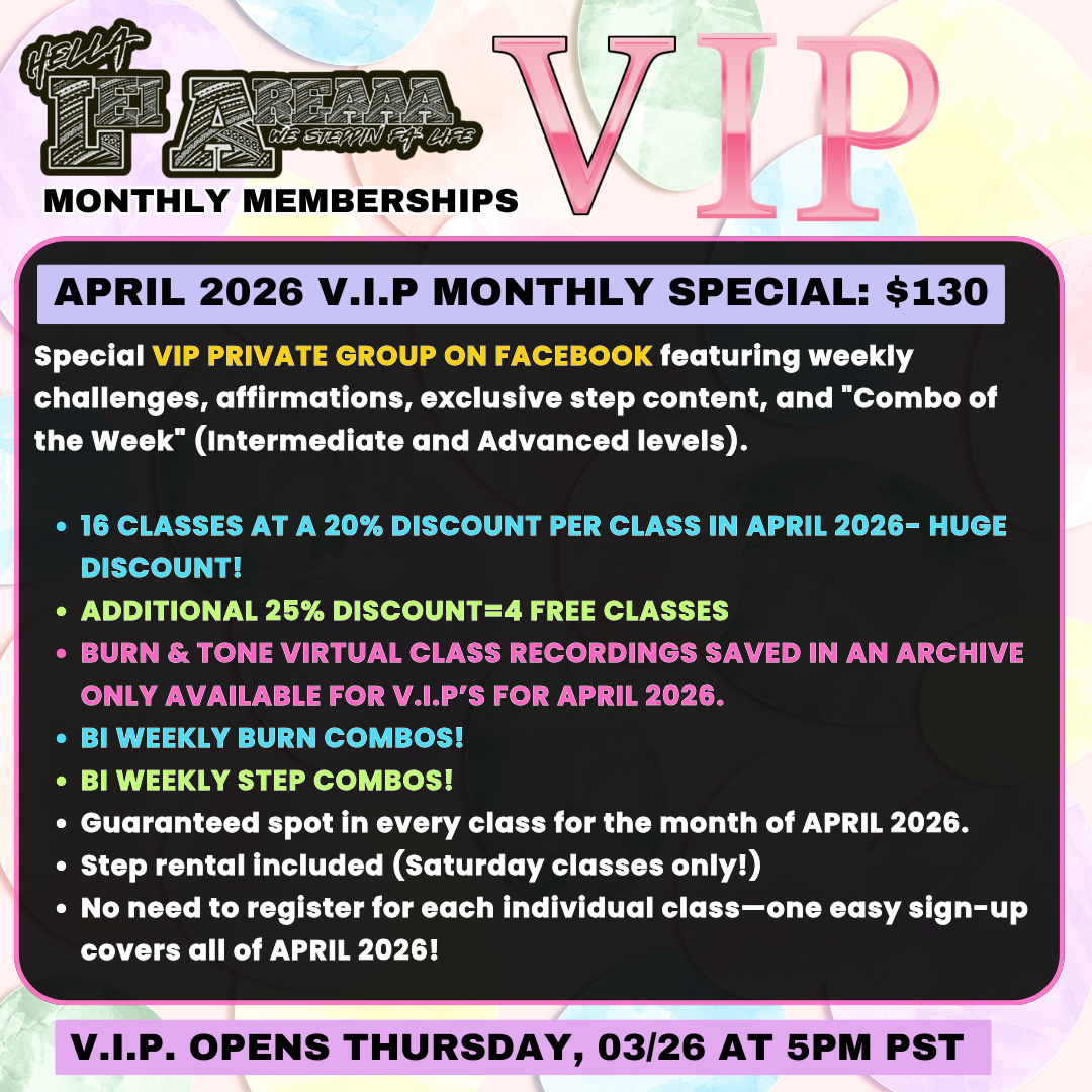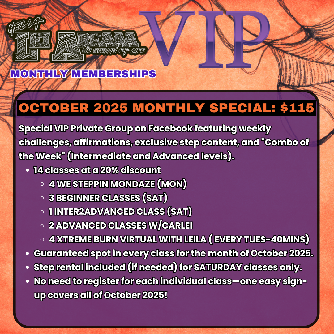 We are now offering membership for my vip loyal steppers! Each month you will have the option of booking a monthly membership for unlimited classes each month. This membership covers all xtreme hiphop and xtreme burn classes with leila for the current month with a HUGE discount.